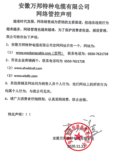 鄭重聲明:安徽萬邦特種電纜有限公司官方網站為:www_wanbangcable_com.jmlxue.com,除此之外無任何子網站或合作網站,其余均為假冒偽劣。電話:0550-7621728 13485756353 地 址:安徽省天長市滁州高新技術產業開發區經四路29號